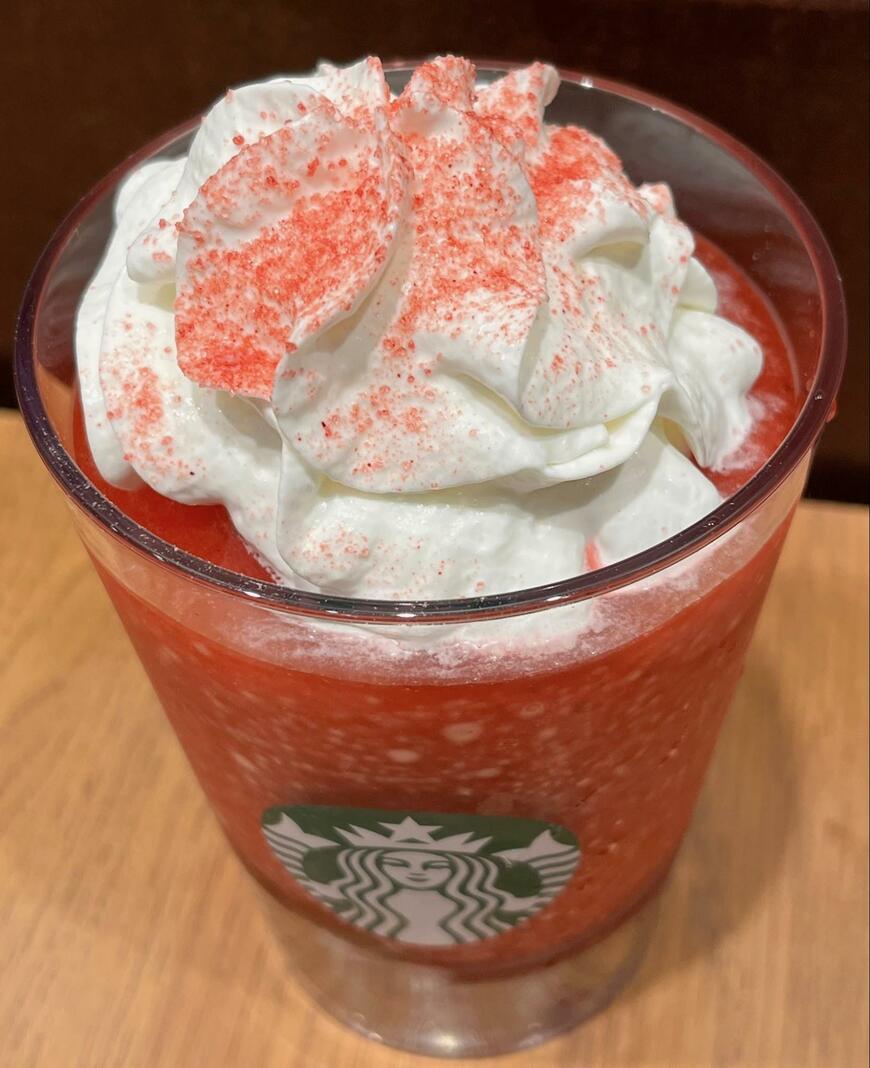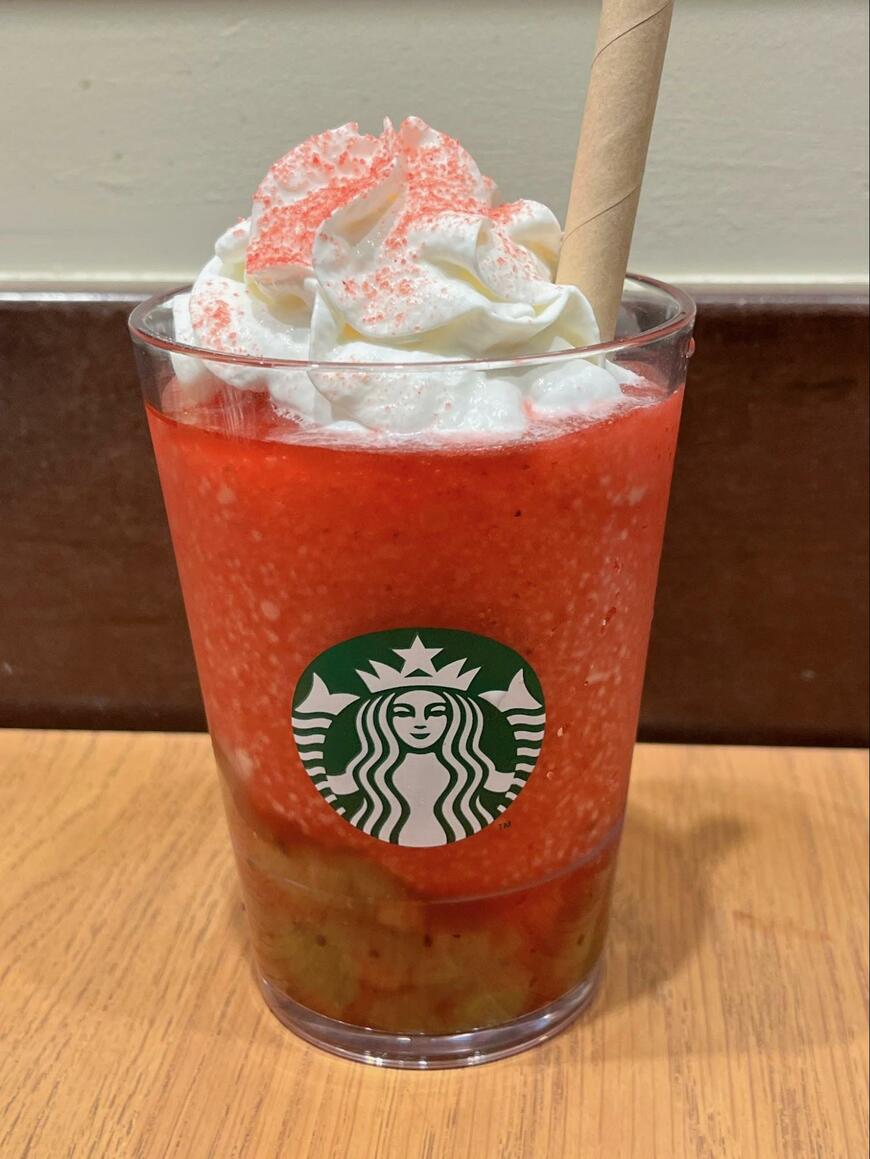 真っ赤なスイカのボディのようなフラペチーノは、パッションフルーツ果肉とドラゴンフルーツ果肉が加えられているようです。下の方はスイカの皮を再現するために、キウイフルーツの明るい緑色とつぶつぶの黒い種が見受けられました。