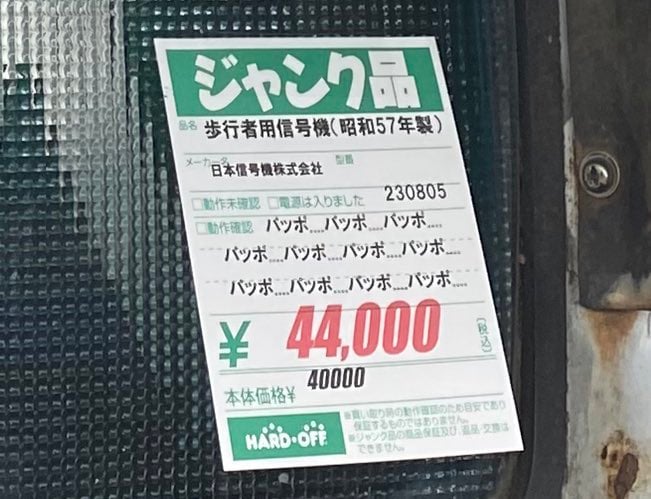 ラベルを見てみると価格は4万4000円とのこと、一体安いのか高いのかまったく見当がつきません。そして注目は動作確認の部分。誰もが信号待ちの際に聞いたことのある「パッポ…パッポ…」の音声がしっかり鳴ることが明記されています。
