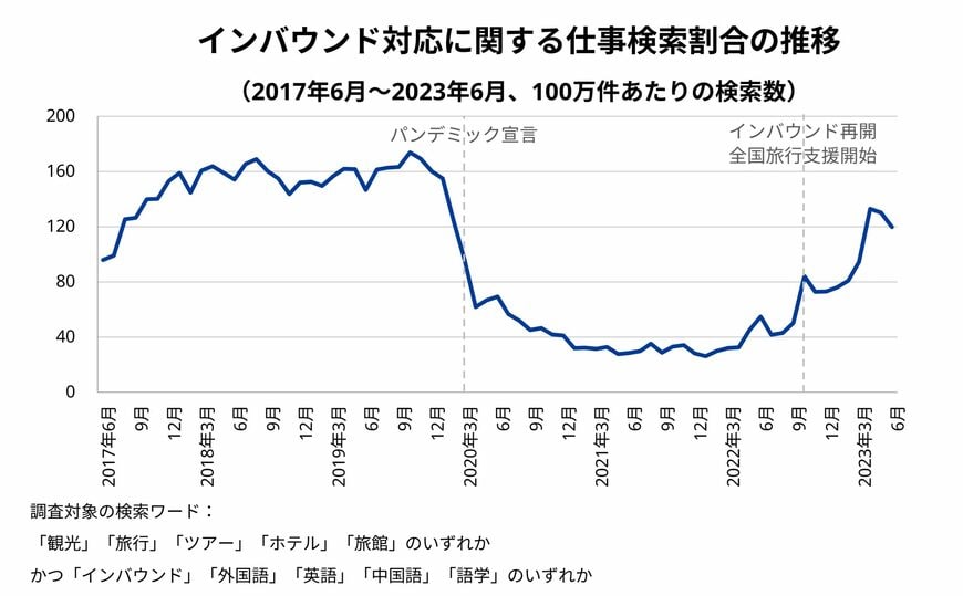 観光業の中でもインバウンドに絞った仕事検索(「観光」「旅行」「ツアー」「ホテル」「旅館」のいずれか、かつ「インバウンド」「外国語」「英語」「語学」のいずれか)も2023年6月は2022年10月の1.4倍、2020年6月の1.7倍と大幅に伸びています。まだコロナ禍以前の高水準には届いていないものの、順調に回復していることが分かります。