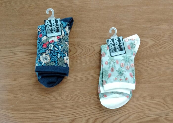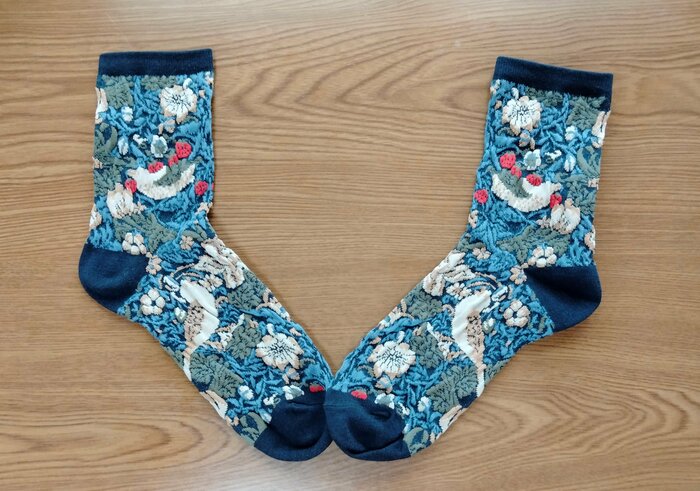 2023年8月、そんなモリスデザインのアイテムに新作が追加されているのを発見しました。「いちご泥棒」といった著名なデザインを使った靴下です。