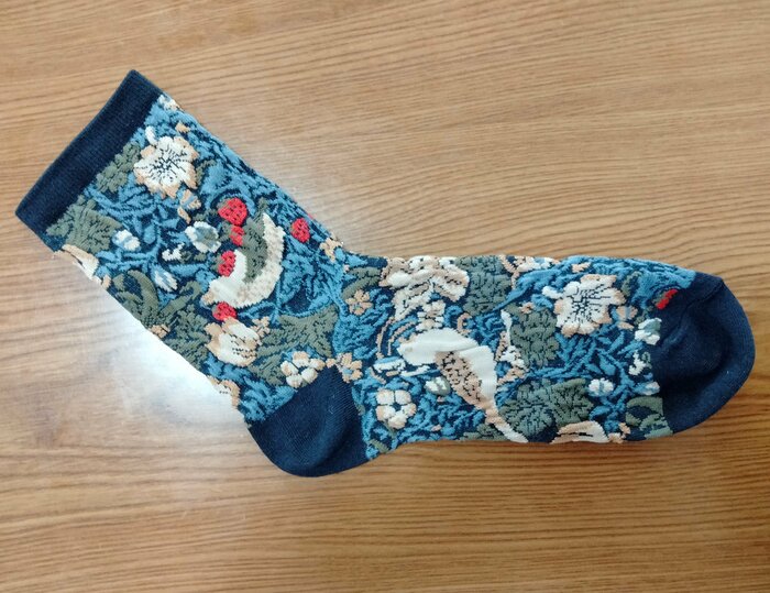 いちごを盗むツグミだけでなく、いちごもかわいらしく編み込まれています。プリント仕様の靴下ではないにも関わらず、モリスのデザインがしっかりと再現されています。