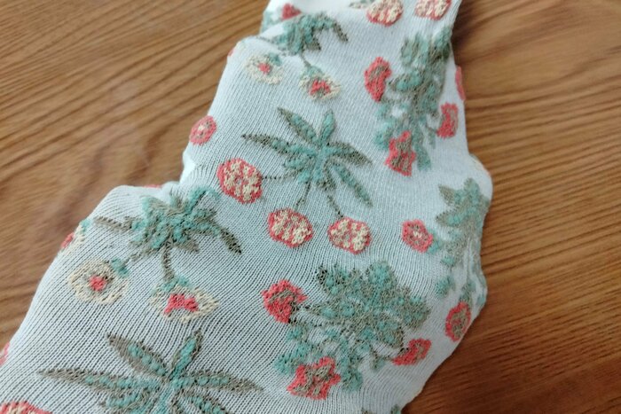 こちらは「いちご泥棒」デザインです。かかとやつま先のブルーカラーのアクセントが素敵な靴下です。