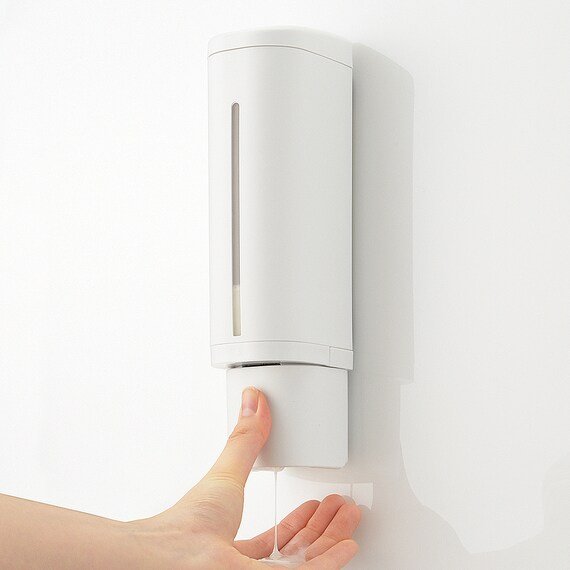 壁に付けて片手で使えるマグネットディスペンサー。シャンプー類を浮かせて設置できるので、床置きのお悩み“ボトル底のヌメリ”を解消してくれる頼もしいアイテムです。