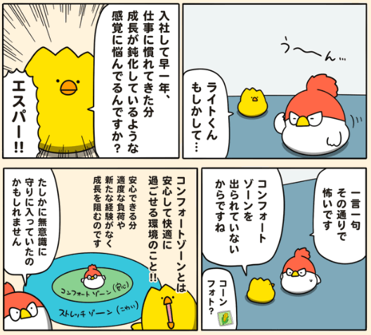 鳥たちが働く会社で、若手の「ライト」が何やら悩んでいました。ライトの様子を見た先輩の「ひよ」は、「自分の成長の鈍化に悩んでいるのでは?」と鋭い質問をぶつけます。そしてその感覚は、自身が安心して過ごせる環境「コンフォートゾーン」の中にいるからだと解説するのでした。