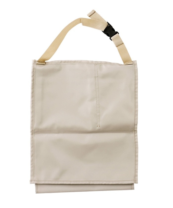 車のヘッドレストにベルトを通すだけで使える収納です。500mLのペットボトルの入るポケットや、ウェットティッシュなどの小物を入れられるポケットがあります。ティッシュ箱もセットできますよ。