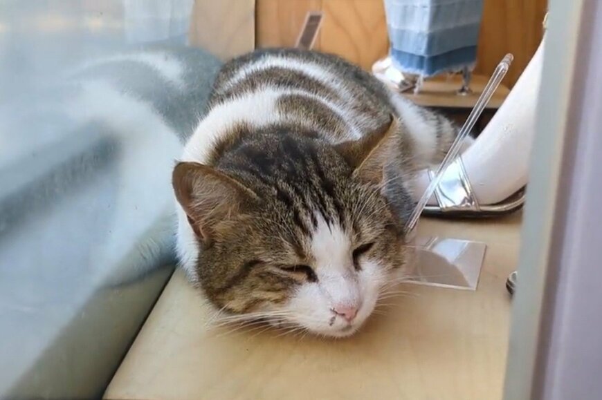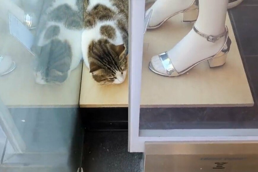 そこに収められていたのは、洋服店のショーウインドーの内側で横になる猫の姿。マネキンと鏡の間でくつろいでいます。