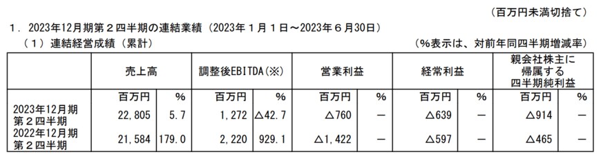 助成金収入の減少は営業利益以下の損益にも影響して、経常損益は▲6億3900万円(前年同期は▲5億9700万円)、親会社株主に帰属する四半期純損益は▲9億1400万円(前年同期は▲4億6500万円)となった。