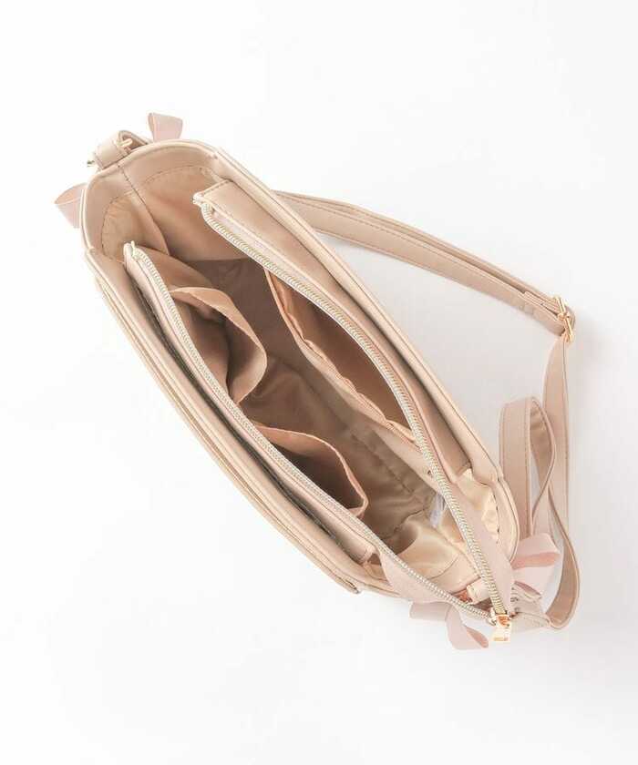 マチ部分にあしらわれたリボンと、存在感のあるゴールドプレートがポイントです。甘めスタイルやフェミニンなファッションにもおすすめ!多ポケットなので、しっかりと荷物も入ります。