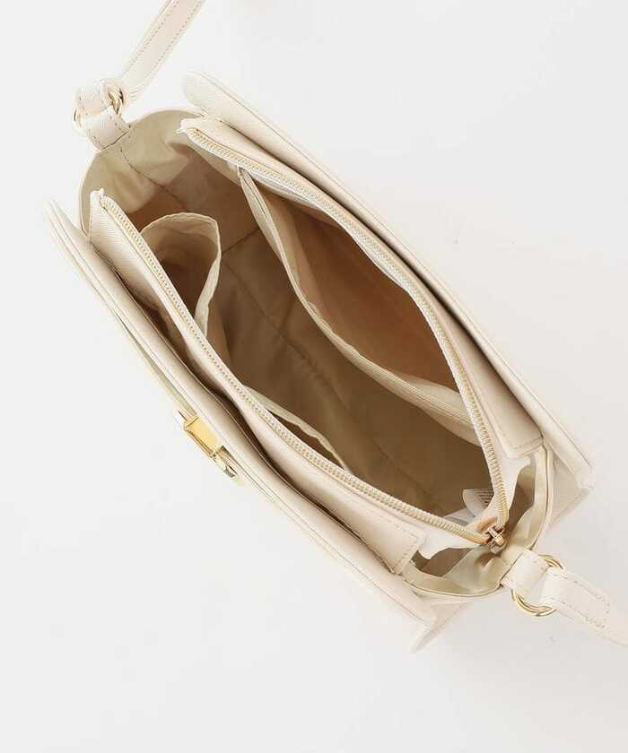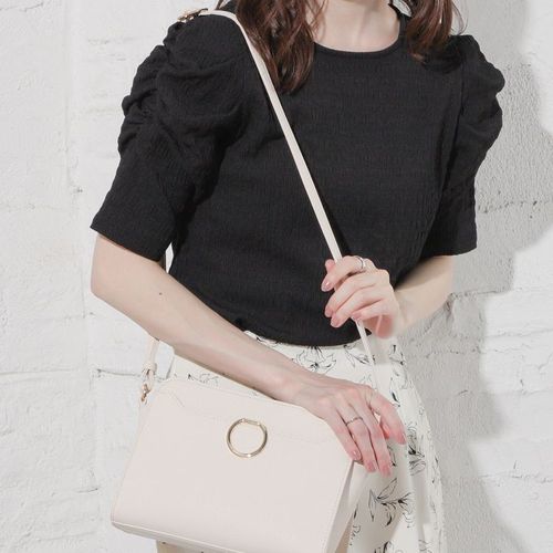 ゴールドのリングが美しく輝く、フェミニンなショルダーバッグです。スクエアフォルムも相まって、上品な印象を与えてくれます。ポケットも多めに付いているので、小物の整理も楽ちんです。