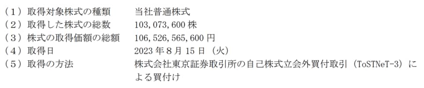 2023年8月15日、同社は株式会社東京証券取引所の自己株式立会外買付取引(ToSTNeT-3)による買付けにて、1億307万600株の自己株式を取得した。