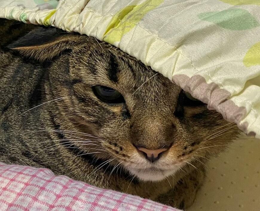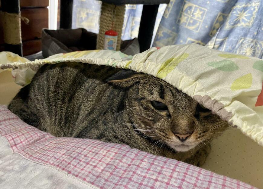 注目を浴びているのは元保護猫の「ヤマト」くん。写真には、お布団とシーツの間らしき場所で香箱座りをするヤマトくんの姿がありました。シーツの中に潜り込んで、居心地がよかったのでしょうか。落ち着いた雰囲気で佇んでいますが、姿は丸見え……!