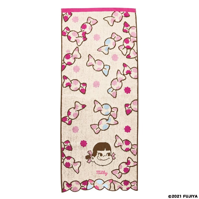 ペコちゃんとミルキーが全体にデザインされた、大判のフェイスタオルです。端の部分にはミルキーのスカラップ刺繍があしらわれており、より目を引くデザインになっています。