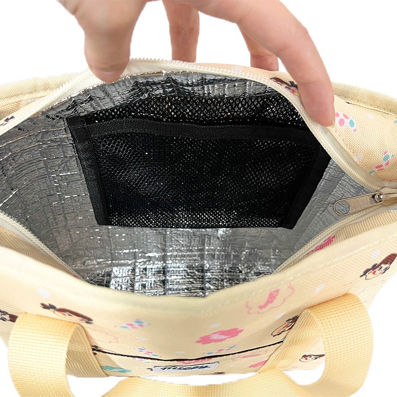 全体にペコちゃんの顔とミルキーがあしらわれた、保冷機能つきのミニサイズトートバッグです。