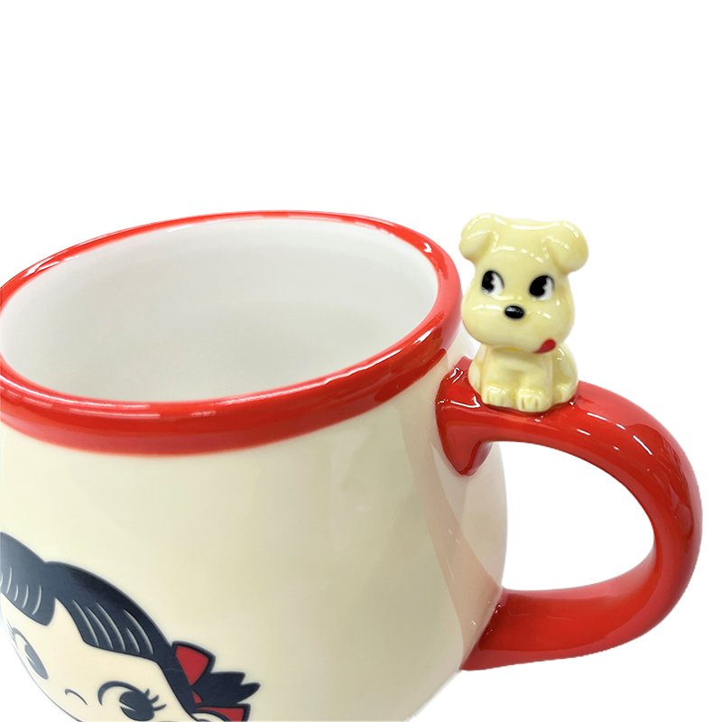 赤い縁取りをした丸みのあるカップに、昭和レトロタッチのペコちゃんのイラストがあしらわれたマグカップです。取っ手部分にちょこんと乗った、犬のフィギュアもとってもキュート。