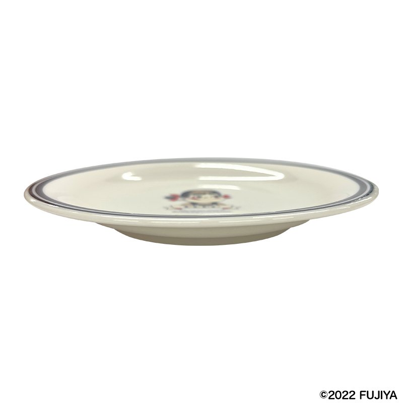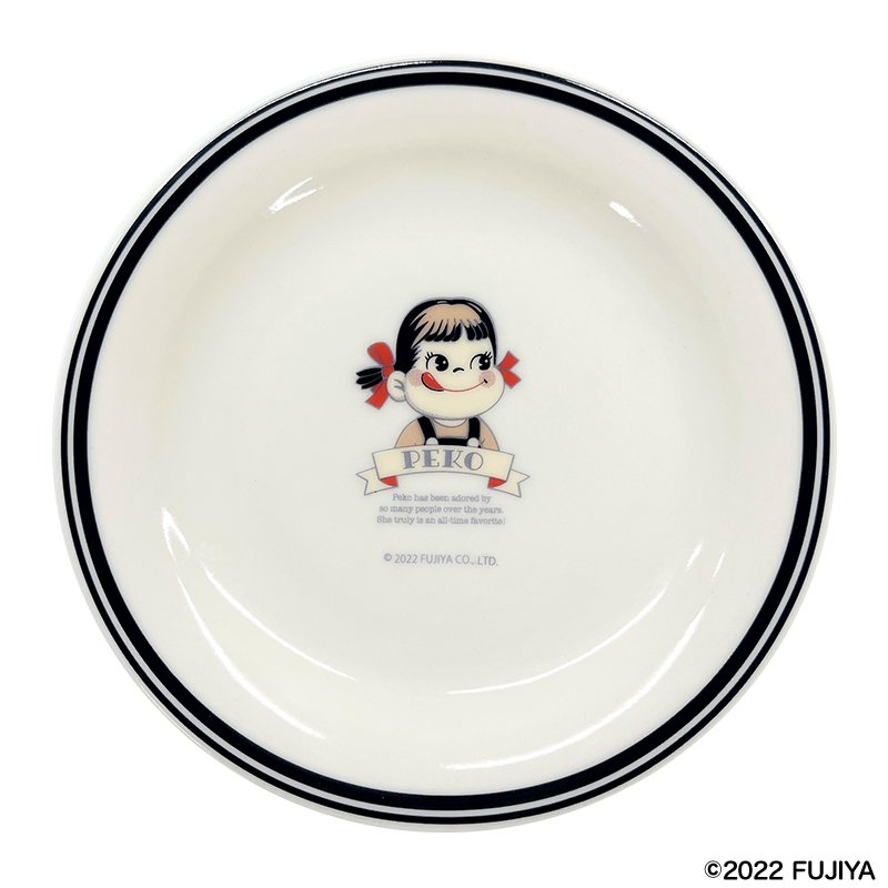 お皿の真ん中にペコちゃんがワンポイントであしらわれた、レトロな色合いとデザインが愛らしい磁器製のプレートです。使いやすいサイズ感で、軽食やお菓子などさまざまなものを乗せるのにぴったり。