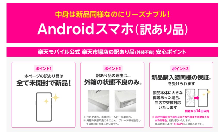 楽天モバイルは2023年8月1日から「楽天モバイル公式 楽天市場店」で「訳あり品(外装不良)」の販売を開始。お得な価格で新品スマホをゲットするチャンスを提供しています。