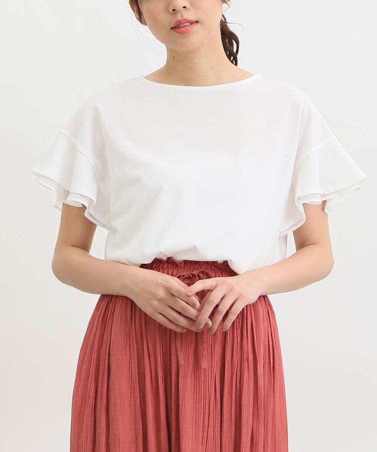 シフォンが2枚重なった、ふわふわヒラヒラゆれる袖がかわいらしいフリル袖Tシャツ。ボートネックと、外側にボリュームのあるデザインで、デコルテや二の腕をすっきり華奢に見せてくれます。