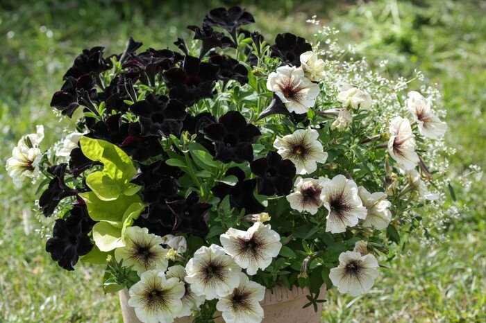 豊富な花色が揃っており、2色以上のペチュニアを組み合わせれば「爽やか」「大人カワイイ」「スタイリッシュ」などテーマに沿った寄せ植えをつくることができます。