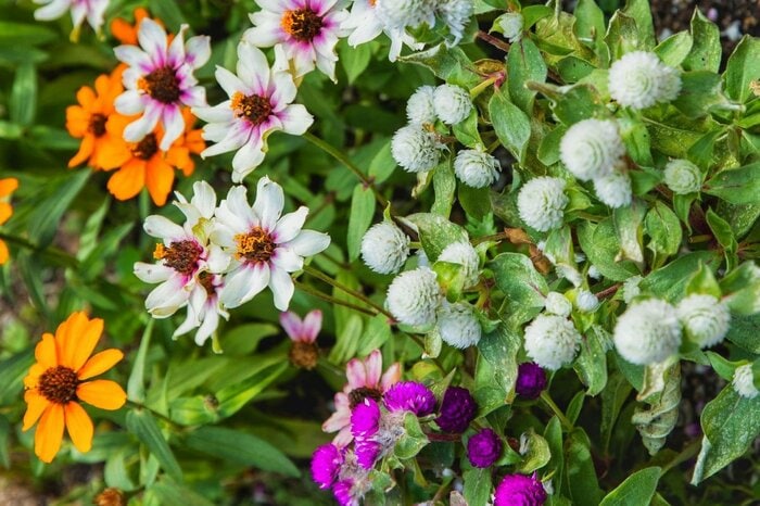 アクセントをつけたいときは、ジニアと同時期に開花するセンニチコウを合わせるのがオススメ。2色のジニア×2色のセンニチコウを楽しく組み合わせてみましょう。