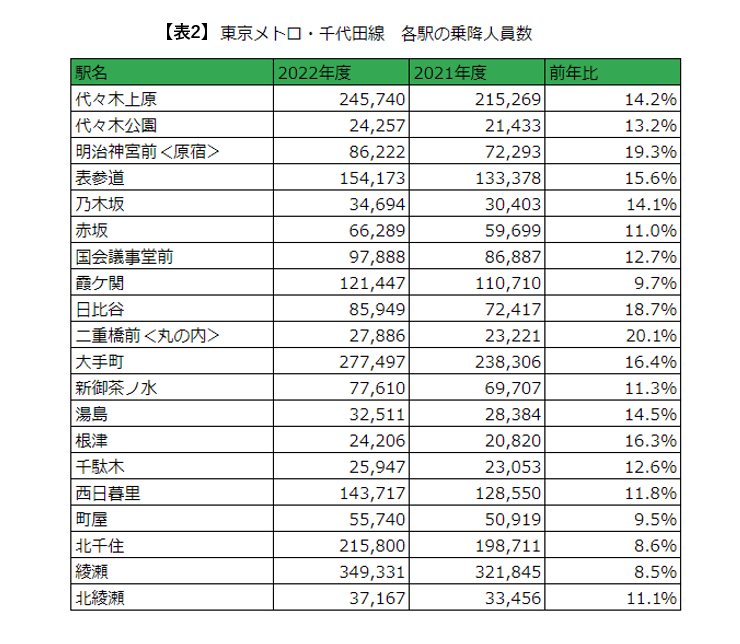 【東京メトロ千代田線】1日の駅別乗降客数は全駅で前年を上回る