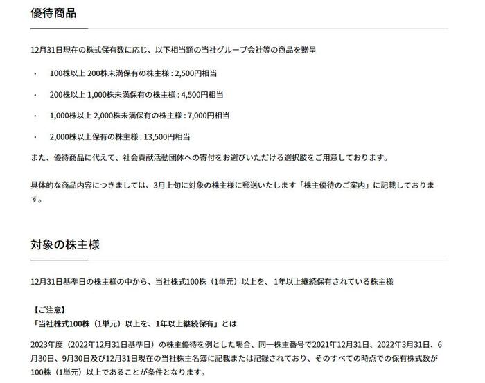 JTは決算期(2023年12月期)現在、12月31日基準日100株以上保有する株主を対象として、グループ会社等の商品を贈呈しています。