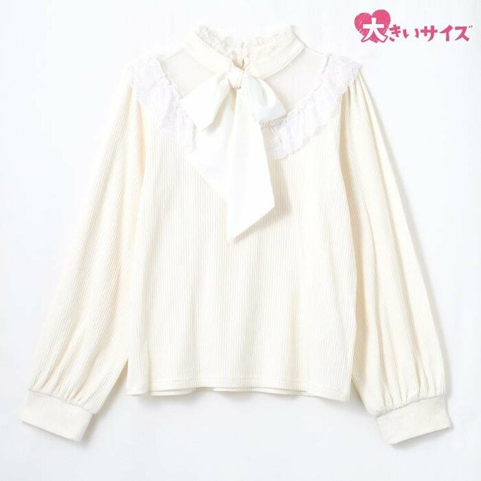 立ち襟と存在感あるボウタイがかわいらしい「プルオーバー」です。こちらもサイズはMから3Lまでがあります。
