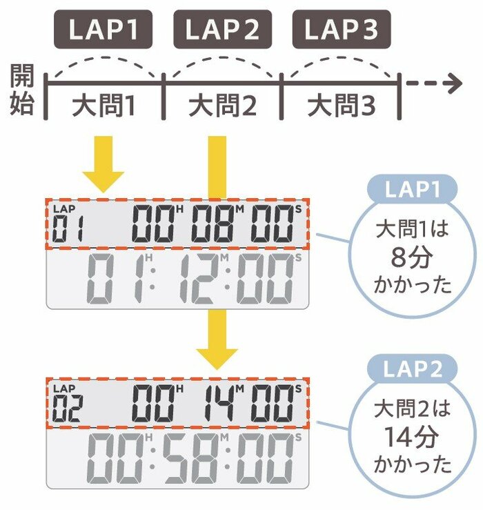 ルラップなら、「LAP/RECALL」ボタンを押すことでラップタイムを記録できます。大問ごとに設定した時間配分を守ることができているか、さらには、どこに時間がかかったかを把握することができるので、効率的な試験対策ができます。