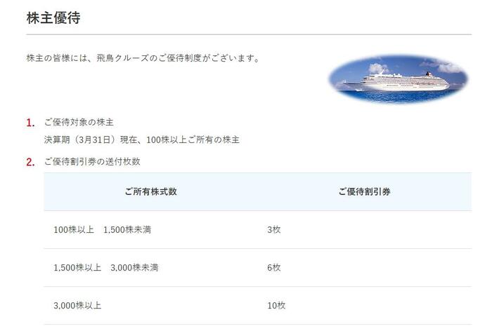 株数に応じて、「決算期後の7月1日より翌年9月30日までのクルーズ」で「優待割引券1枚につき1クルーズ1名様10%の割引」が利用できます。