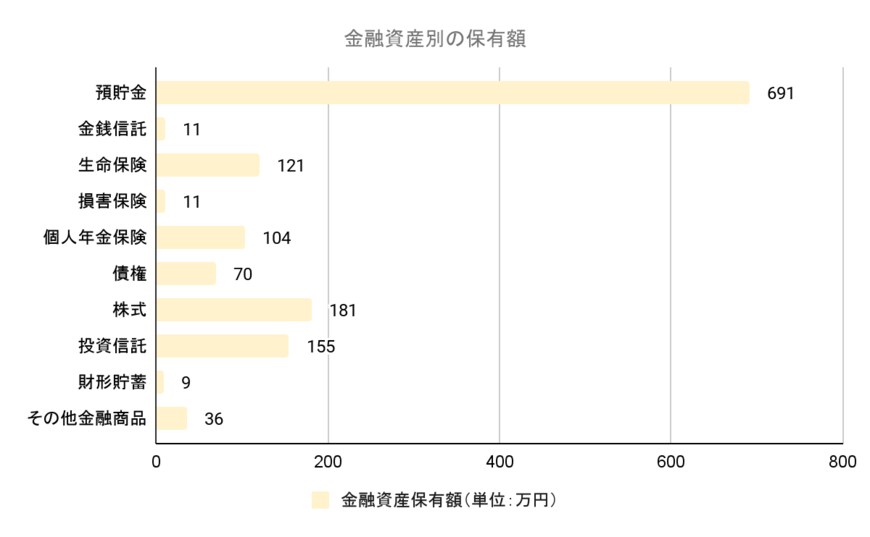 「預貯金」の割合が最も高くなり、次いで「株式」「投資信託」「生命保険」が続きます。