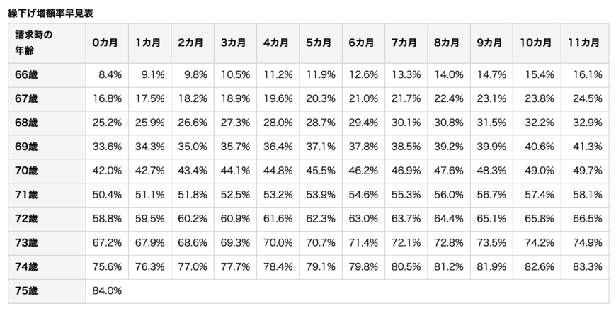 1ヵ月年金開始時期を繰り下げるごとに0.7%増え、最大10年で84%も増やすことができ、その増額率が変わることはありません。