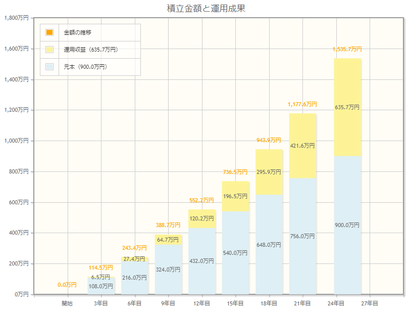 40歳から始めたとすれば、同じく65歳の時点で運用益が約636万円となり、元利合計で約1536万円を準備できる試算です。