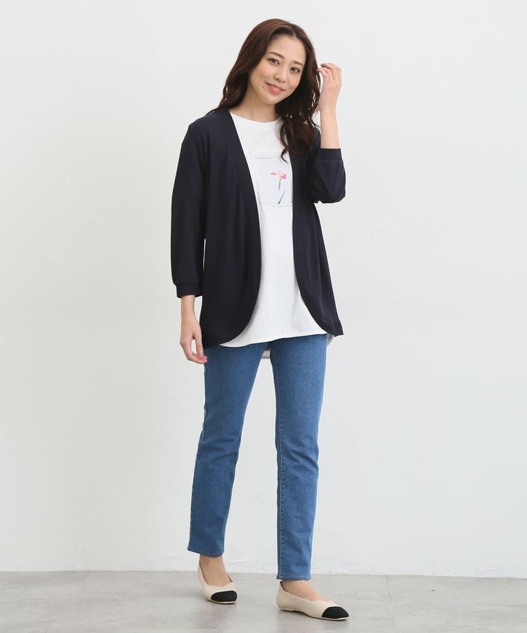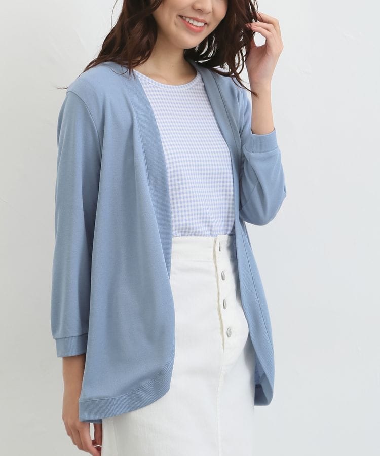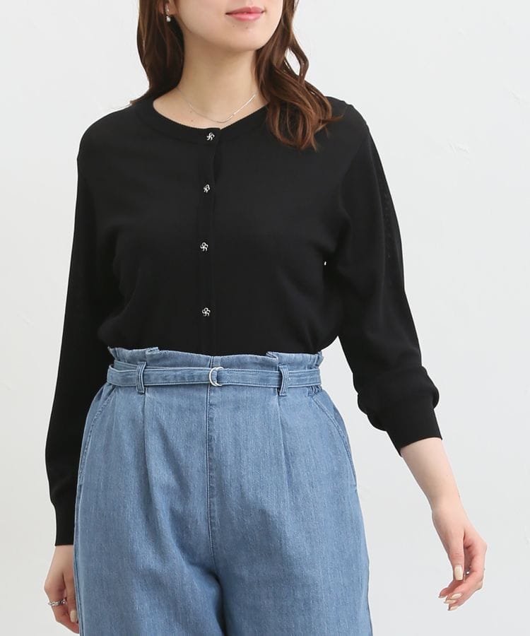 クルーネックのデザインと、フラワーモチーフのボタンがかわいらしい印象を与えてくれます。UVカットだけでなく、抗菌防臭や接触冷感の機能もついているので、暑い季節のカーディガンにぴったりです。
