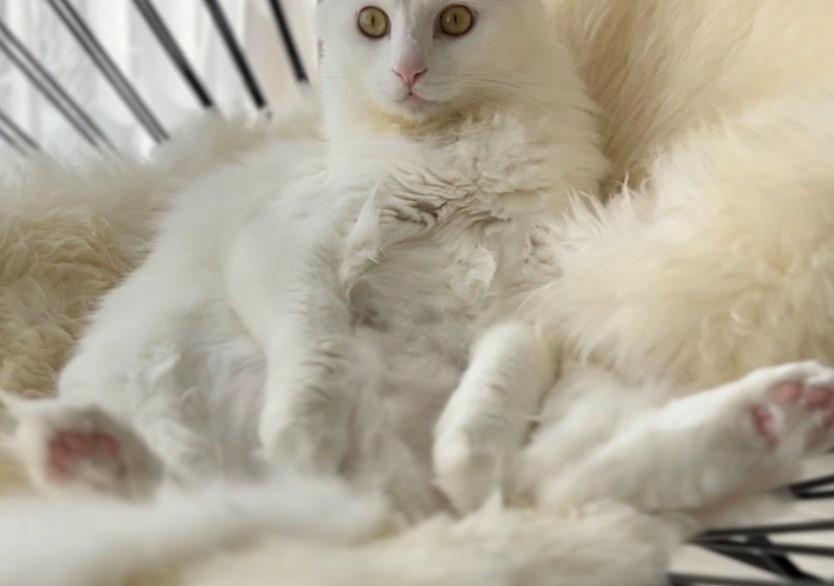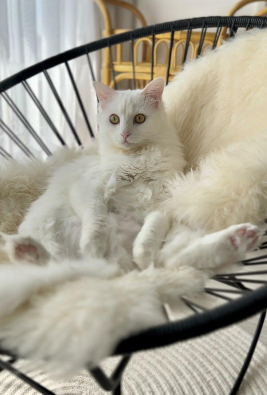 注目を浴びているのは、白猫の男の子「マオ」くん。写真には、真っ白なクッションが敷かれたイスらしき場所でくつろぐマオくんの姿がありました。