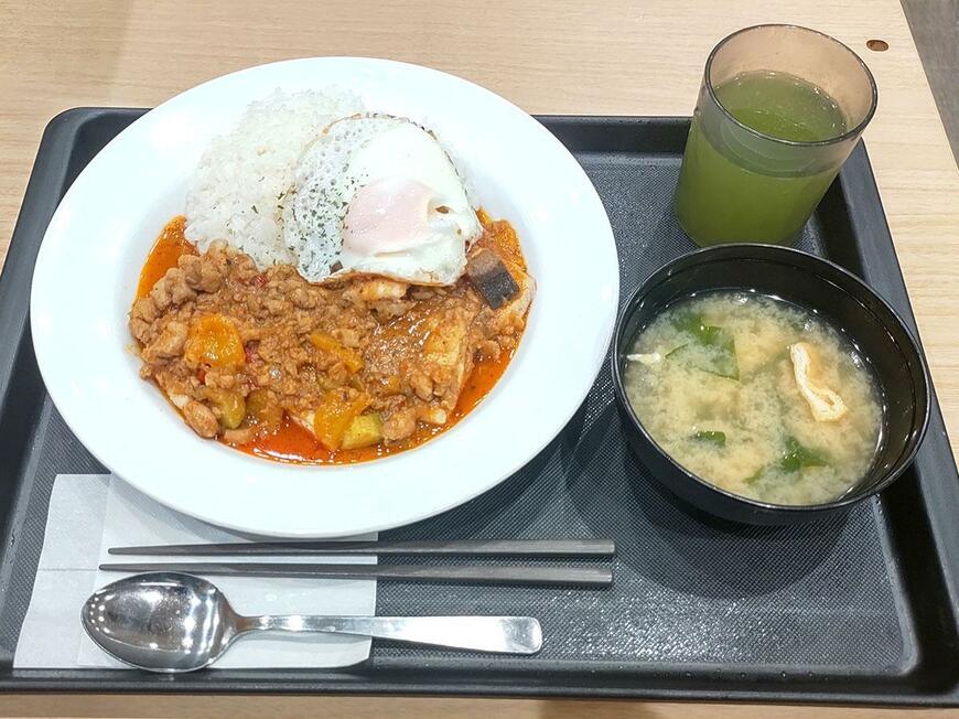 注文して5分ほどでガパオチキンライスが完成。カレーライスに近いビジュアルですが、具材が多く、目玉焼きも乗ってボリューム感があります。商品を受け取るやいなや香辛料のようなスパイスの効いた香り。これには食欲がそそられますね。