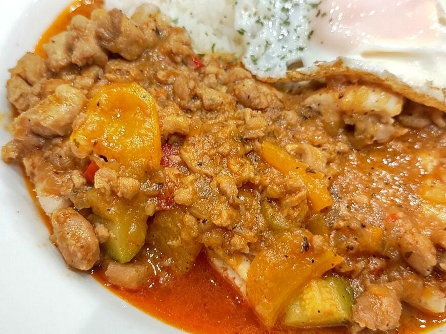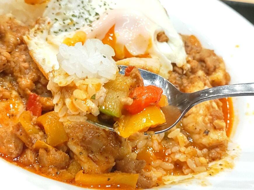 他に具材はズッキーニ・赤と黄2種のパプリカ。どれもしっかり煮込まれており、野菜本来の甘味が際立ちます。目玉焼きをスプーンで割ると半熟でトロっと黄身があふれ、スパイシーなソースの辛さが少し和らぎますね。