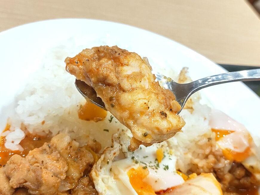 鶏もも肉が1枚分まるごと入ったごろごろチキン。大きめにカットされており、口に入れると意外にもふわっと柔らかな食感を楽しめます。