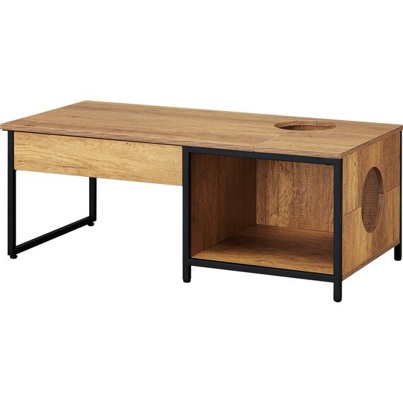テーブルの右半分が猫のパーソナルスペースになっているテーブルです。黒の枠組みがおしゃれです。