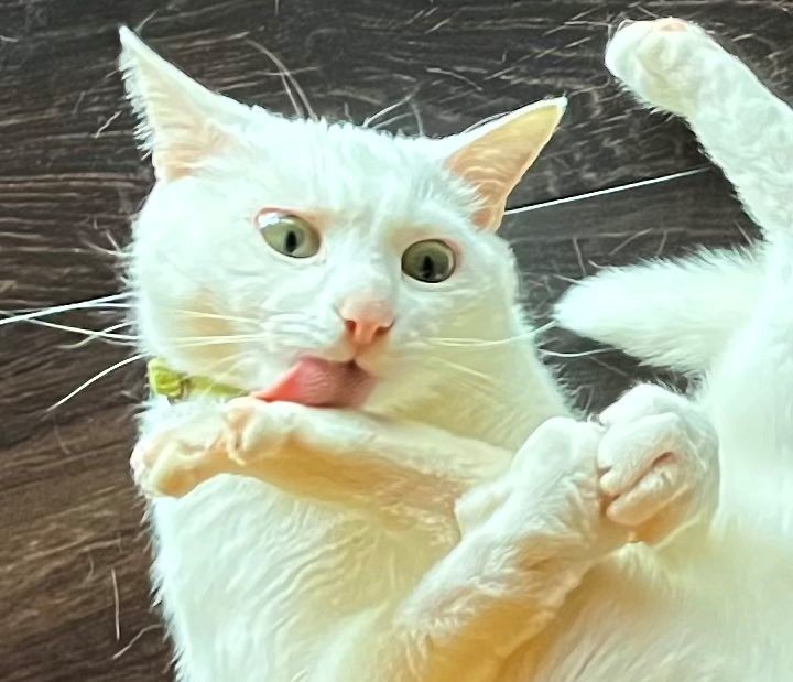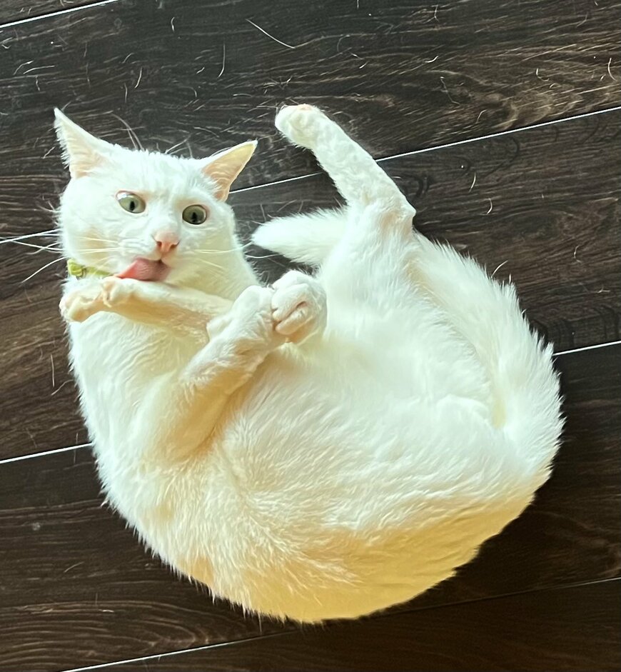 注目を浴びているのは1匹の白猫ちゃん。投稿された写真には、床に寝そべって毛づくろいをする白猫ちゃんの姿がおさめられていました。