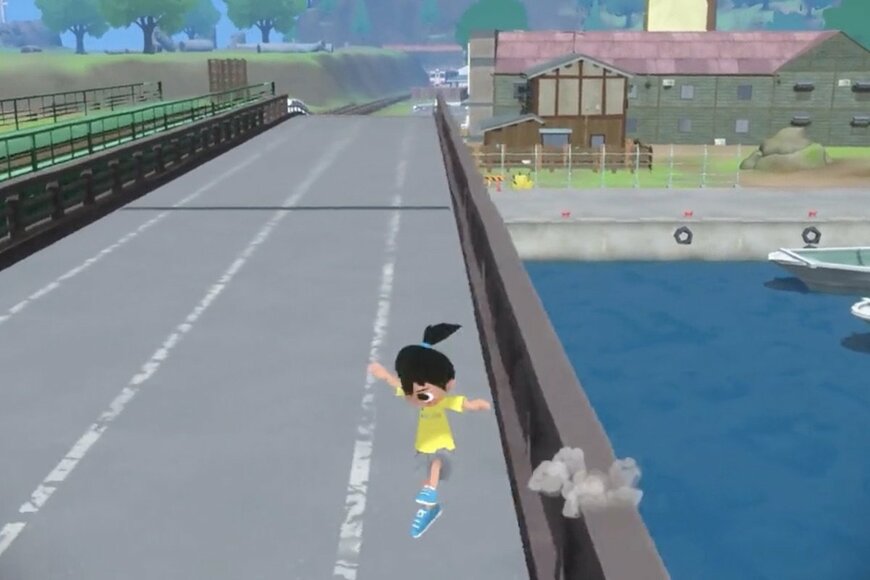 海へ向かって飛び込んだ次の瞬間、水面ギリギリで体制を立て直し、バク転をして橋の上に戻って来ています。人間とは思えない驚きの身体能力。なつもん…いったいどういうゲームなのでしょうか。