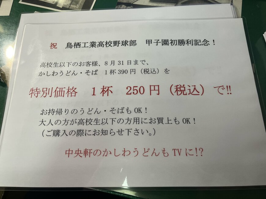 甲子園での初勝利を記念して、かしわうどん・そば(税込390円)が税込み250円になっているのです。8月31日までなので、気になる人は店舗まで足を運んでみてはいかがでしょうか。