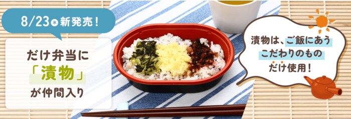 お漬物をたっぷり楽しみたい人はもちろん、夏の疲れで食欲が落ちている人や飲み会のシメに楽しみたい人など、多くのニーズが考えられる「だけ弁当(漬物)」。自分らしいアレンジが広がる一品なので、気になる方はぜひチェックしてみてくださいね。