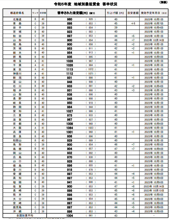 2023年度の最低賃金目安を受けて、各都道府県の改定額が公表されました。【図表1】にて確認しましょう。