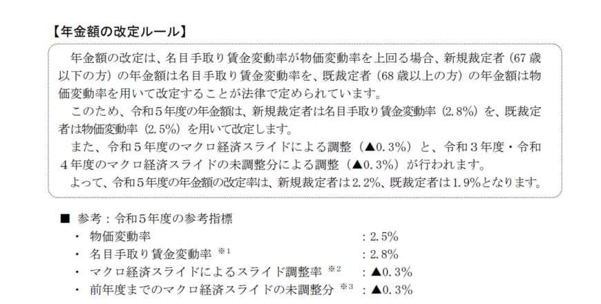 2023年度の年金額は新規裁定者(67 歳以下の方)は前年度から2.2%の引き上げ、既裁定者(68 歳以上の方)は1.9%の引き上げとなりました。