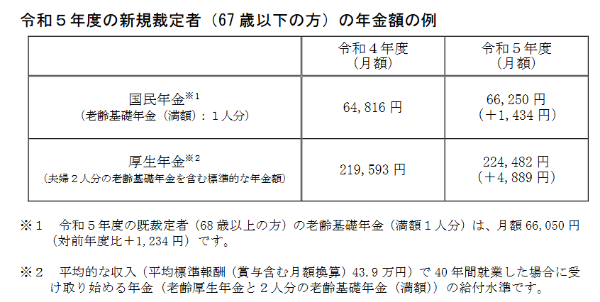 - 厚生年金の月額:モデル夫婦の二人分 22万4482円(2022年度:21万9593円)+4889円