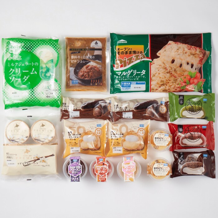- セット内容:白州名水かき氷×1袋4個入(白州名水かき氷 ミルクジェラートのクリームソーダ・白州名水かき氷 ミルクジェラートのコーヒーフロートの2種のうちいずれか1種が入っています)、Chateraise PREMIUM×1袋4個入(マダガスカルバニラ・ストロベリー・京都宇治抹茶・発酵バターラムレーズンの4種のうちいずれか1種が入っています)、フローズンゼリー ぶどう×1個、フローズンゼリー 白桃×1個、フローズンゼリー ブラッドオレンジ×1個、ホイップクリーム大福 苺×1個、ホイップクリーム大福 抹茶×1個、ホイップクリーム大福 チョコ×1個、糖質82%カットのプリン キャラメルナッツクリーム×2個、糖質50%カットのチョコカスタードエクレア×2個、糖質50%カットのダブルシュークリーム×2個、オーブンでそのまま焼けるピザ マルゲリータ×1個、HOTEL MADE カレー×1個(蓼科牛と白麗茸のビーフカレー・福味鶏のバターチキンカレー・科の豚とたけのこのキーマカレーの3種のうちいずれか1種が入っています)