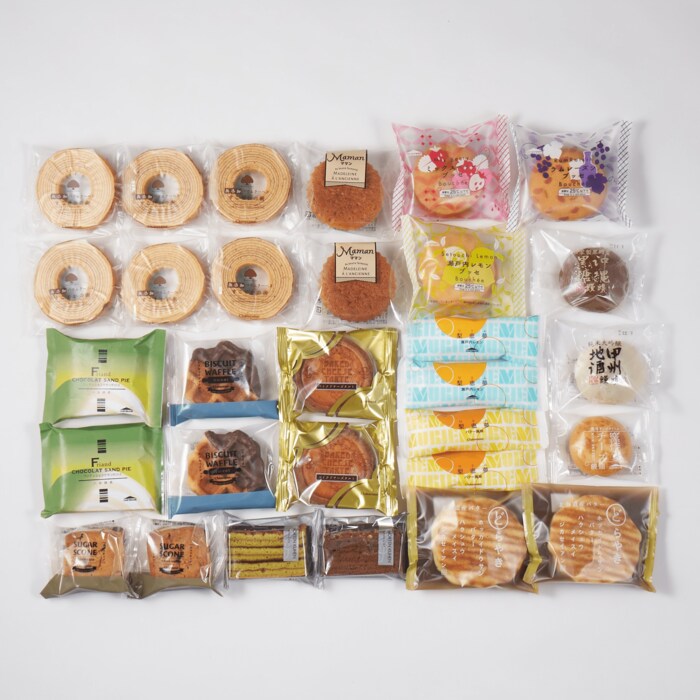 - セット内容:ミックスベリーブッセ×1個、ラムレーズンブッセ×1個、瀬戸内レモンブッセ×1個、シュガースコーン チョコチップ×2個、ビスキュイワッフル スイート×2個、フリアンショコラサンドパイ八女抹茶×2個、無添加バウムクーヘン すこやかの樹×6個、ベイクドチーズタルト×2個、梨恵夢 バター風味×2個、梨恵夢 瀬戸内レモン×2個、ノーテンクーヘン ショコラ×1個、ノーテンクーヘン ピスタチオ×1個、ママン×2個、北海道産バターどらやき×2個、窯焼きチーズ饅頭×1個、沖縄黒糖饅頭×1個、甲州地酒饅頭×1個