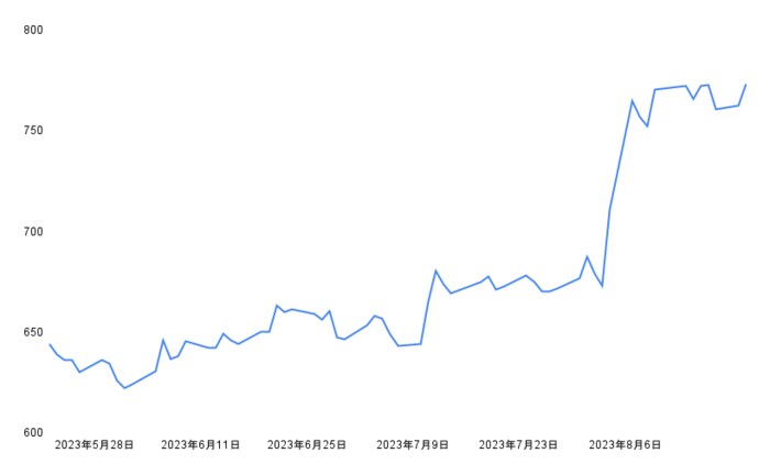 - 1年後の株価の終値:773.1円
