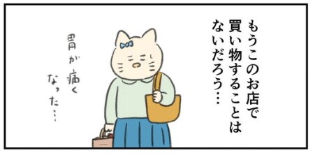 なんとかお会計を済ませたネコは、帰り道で「もうあのお店で買い物することはないだろう…」とゲッソリしていたのでした。