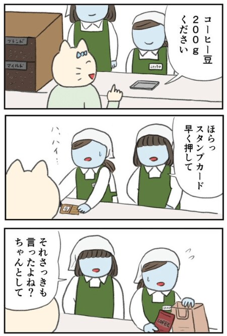 この日、ネコはコーヒー豆を買いに近所のスーパーへ足を運んでいました。お会計に進むと、レジ奥は何やら不穏な様子。先輩店員が新人へ、「スタンプカード早く押して」「それさっきも言ったよね?」と横から厳しい声かけをしていたのです。一部始終を見守るネコは何を感じたのでしょうか…?