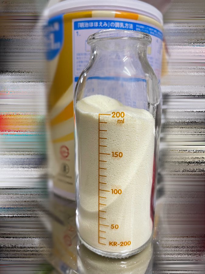 そこに収められていたのは、200mlのラインまで粉ミルクが入れられた哺乳瓶。使用している「明治 ほほえみ」の付属スプーンはすりきり一杯(約2.7g)で20mlなので、大量のミルクを作ることができます。
